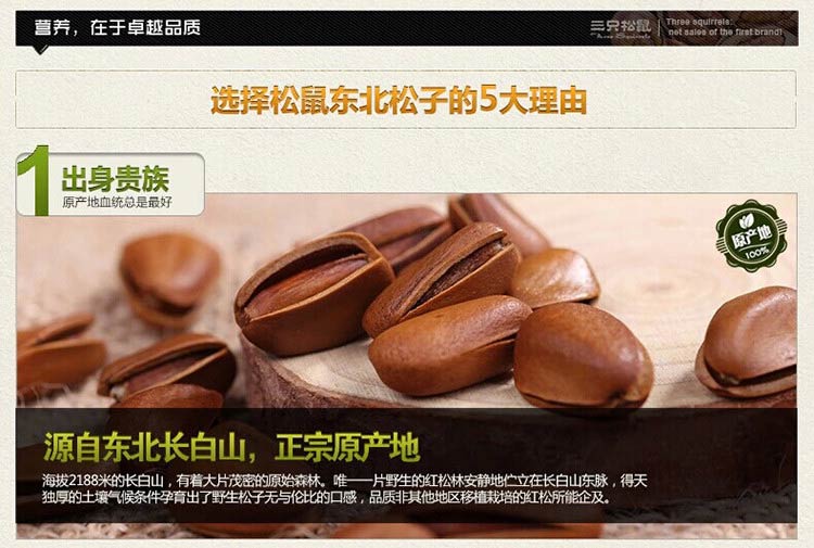 商品名称:【三只松鼠】东北松子218g原味袋装开口...商品编号:1023204044店铺:三只松鼠官方旗舰店上架时间:2013-11-15 11:37:12商品毛重:218.00g商品产地:中国大陆国别:国产类别:松子特性:带皮包装:袋装口味:原味价位:0-10